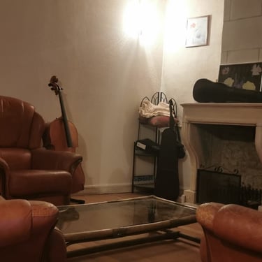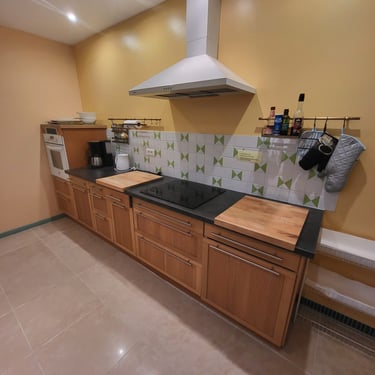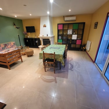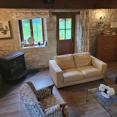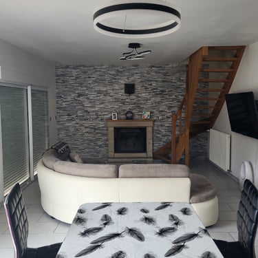 Chauffage avec clim reverssible dans le salon, poêle à bois et radiateurs electriques.